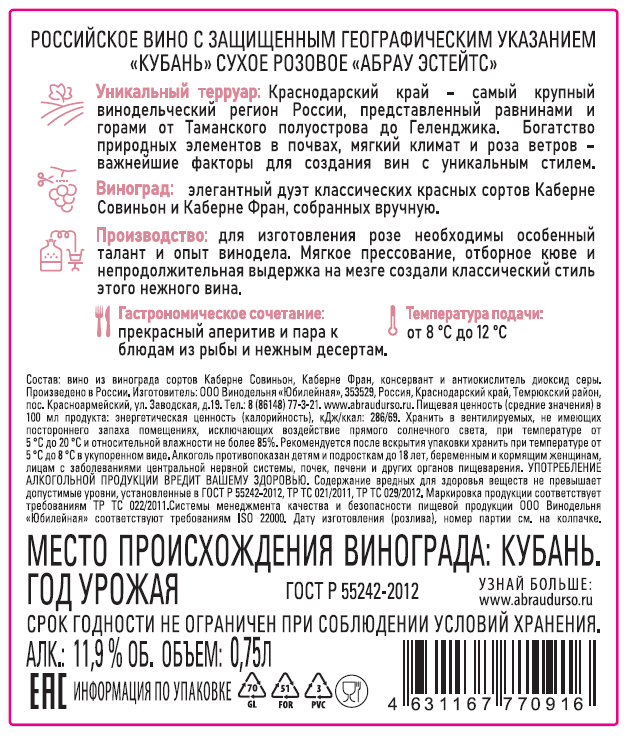 Купаж на основе сортов группы Каберне, выполненный в лучших традициях юга Франции. Виноград выращивается на терруарахвблизи грязевых вулканов и собирается только вручную с самых старых лоз нашего терруара, возраст которых достигает более 20-ти лет. По прибытию на винодельню, виноград отбирают и происходит гребнеотделение. Розе произведено отдельным кюве, по методу прямого прессования, без механического воздействия. На производство приходится только 30% от всего объема сусла самотека. За счет минимального механического воздействия на ягоды, зеленый танин из кожицы, а также горечь косточек типичная для красных сортов винограда не попадает в сусло, позволяя добиться нужной свежести и легкости. Вино выдерживается на тонком дрожжевом осадке с регулярным батонажемдля особого нежного стиля.