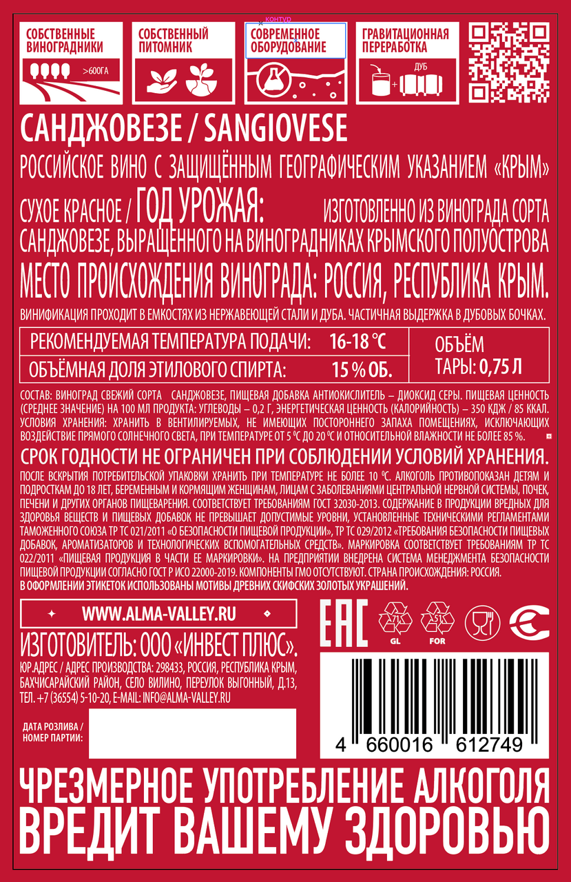 Вино Alma Valley Sangiovese красное сухое, 0.75л