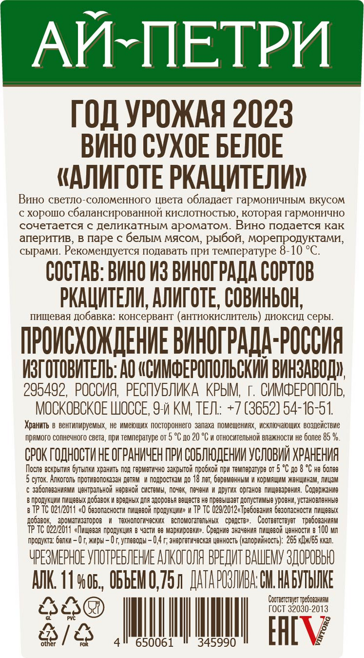 Виноград сортов Ркацители, Алиготе, Совиньон, пищевая добавка: консервант (антиокислитель) диоксид серы.