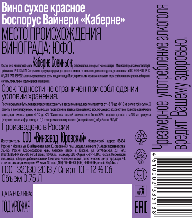 Виноград сорта Каберне Совиньон, антиокислитель, консервант - диоксид серы.