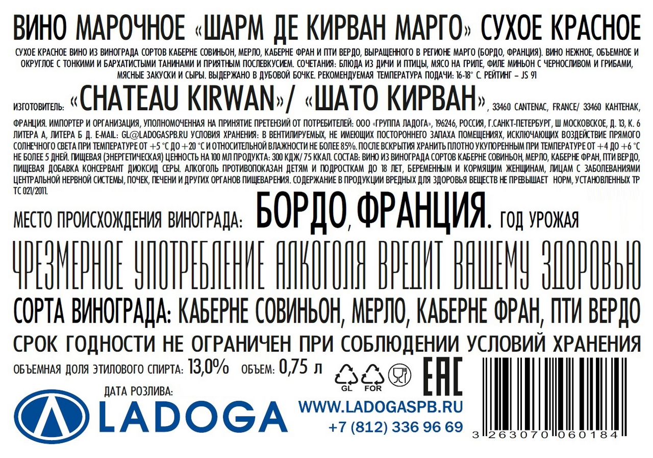 В течение трех веков три именитые семьи наследовали виноградные владения Гран Крю Классе в местечке Кантенак, коммуна Марго, Франция. Шато Кирван - замок невероятной красоты, построенный Марком Кирваном в конце 18 века в неоклассическом стиле. Марк Кирван - по происхождению ирландец - унаследовал данные владения, женившись на одной из дочерей собственника земель сэра Джона Коллингвуда. Последний был крупным торговцем родом из Бордо и экспортировал вино и продовольственные товары в Англию - на тот момент основной рынок сбыта для Бордо. Марк Кирван расширяет виноградные владения, присоединив прилегающие виноградники, расположенные на знаменитом плоскогорье Кантенак - винодельческое хозяйство Гане и землю Лассаль. В 1855 году во время отбора вин от округа Медок на международную выставку, организованную Наполеоном III в Париже, шато Кирван занял первое место среди трех вин Гран Крю Классе провинции Медок. С 1903 года вина шато Кирван, как и другие престижные вина Бордо, продаются под маркой семейного винного дома Maison Schroder & Schyler (дом времен Ганзейского союза, самый старинный на сегодняшний день в Бордо). Шато Кирван становится главным поставщиком вин Бордо Гран Крю в Прибалтику, Нидерланды, Гамбург, Любек, Калининград, Санкт-Петербург, Москву. Уже в то время вина Шато Кирван высоко ценили при императорском дворе Николая II, а в начале прошлого века производство вин в данной провинции расцвело с былым блеском, расширились поставки в Северную Европу и на крупные мировые винные рынки из Бордо. Вина Кирван (шато Кирван Гран Крю Классе и Шарм де Кирван, второе вино хозяйства) не оставят вас равнодушными благодаря насыщенной палитре с ароматами чёрных фруктов, пряными нотками, богатым фруктовым запахом, утончённостью во вкусе, сочетанием величественного и изящного, очарует вас тонкой финальной ноткой, полной гармонии, доходящей до художественного и технического совершенства. Шато Кирван, 3-е Гран Крю Классе Марго, собственность семьи Schler в 4 поколениях, представляет собой настоящее художественное воплощение: около тридцати видов вина с различных территорий и недавно освоенных земель виноградника в 38 га, тщательно винифицируются в чанах и настаиваются в бочках, половина из которых в новых бочках. Это вино покорит вас своей молодостью и свежестью сегодня, очарует вас завтра и порадует вас вкусовыми изменениями с течением времени. Второе вино Chateau Kirwan, лёгкое и пленительное, с фруктовым ароматом и мягким, сочным вкусом. В купаже сочетаются традиционные сорта: Каберне Совиньон, Мерло, Каберне Фран и Пти Вердо, при этом доля Мерло выше, что придаёт вину особую округлость и мягкость.Виноград собирается вручную и тщательно сортируется, затем винифицируется в терморегулируемых цементных чанах тюльпанообразной формы. Одновременное протекание алкогольной и малолактической ферментации сохраняет свежесть и чистоту аромата. Половина вина выдерживается в бетонных чанах, половина - в бочках первого наполнения, создавая гармоничное сочетание фруктовости и тонких древесных нюансов. Подходит к мясу на гриле, жареному мясу, дичи и зрелым сырам.