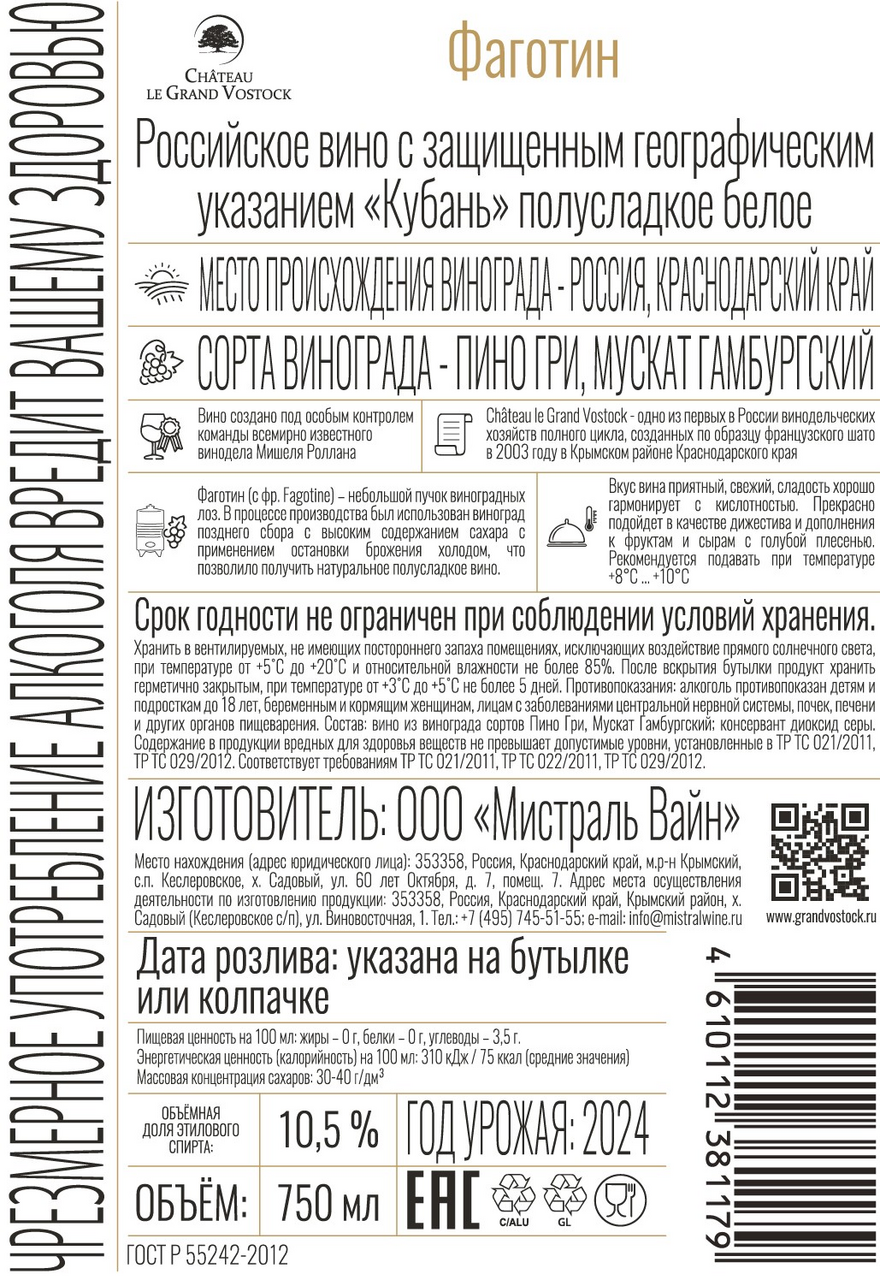 Вино Chateau Le Grand Vostok Fagotine белое полусладкое, 0.75л