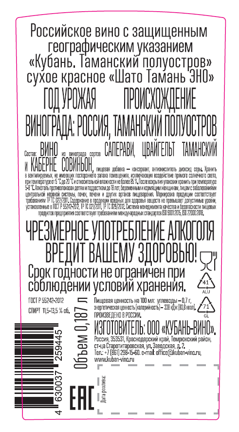 Виноград сортов Саперави, Цвайгельт Таманский, Каберне Совиньон, пищевая добавка-консервант (антиокислитель) диоксид серы.