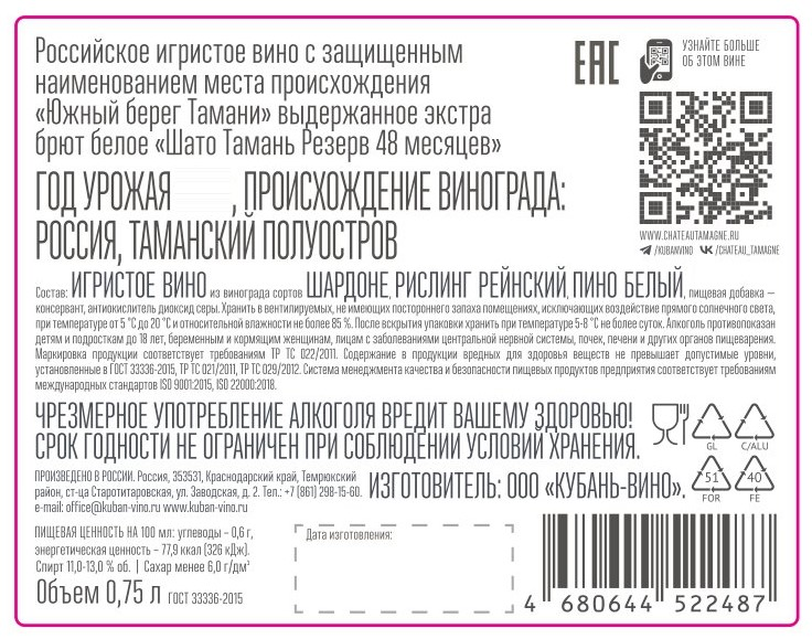 Коллекционное Шато Тамань Резерв 48 месяцев - это квинтэссенция выдержки, селективного отбора и исключительного вкуса. Лимитированное игристое вино, произведённое классическим методом вторичного брожения в бутылке, прошло путь длительной выдержки на осадке не менее 48 месяцев, чтобы предстать во всей полноте своего зрелого характера в подарочном оформлении.Цвет выдержанного экстра брют белого светло-соломенный с тонкими переходами от зеленоватых до золотистых оттенков. Аромат развитый, глубокий: ноты спелых фруктов и белой мякоти гармонируют с минеральной строгостью и благородной выдержкой. Вкус полный, сбалансированный, гармонирующий с ароматом, с точной структурой и продолжительным послевкусием. Игристое представлено в премиальной подарочной упаковке, не требующей дополнительного оформления - идеальный выбор для элегантного подарка, делового жеста или пополнения личной коллекции. Тираж ограничен 8 420 бутылками. Рекомендуется подавать охлаждённым до 5-7С в бокалах для игристого в паре с изысканными закусками.