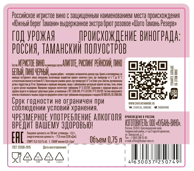 Игристое вино с ЗНМП Южный берег Тамани выдержанное экстра брют розовое Шато Тамань Резерв произведено из винограда сортов Алиготе, Рислинг рейнский, Пино Белый и Пино Черный, выращенного на плодородных почвах Таманского полуострова. Цвет розового экстра брюта бликует оттенками различной интенсивности от жемчужно-розового до розового. Букет раскрывается ярко, слаженно, сочетая в себе ягодную доминанту и минеральную свежесть. Вкус насыщенный и изысканный с долгим развивающимся послевкусием и приятной терпкостью. Тонкая жемчужная пена и долгая игра пузырьков создадут атмосферу праздника и подчеркнут торжественность момента.