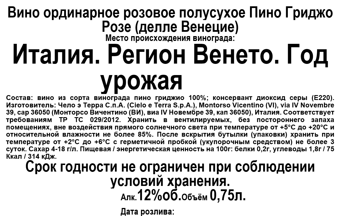 Вернуться назад Вино Cielo Пино Гриджио Розе розовое полусухое, 0.75л Оставить отзыв Артикул: 72280 Поделиться В избранное Раскупили Сообщить о поступлении Подтвердить возраст Узнать наличие в магазинах Бренд CIELO Страна-производитель Италия Подробнее Описание Элегантное, гармоничное вино нежно-розового цвета с тонким ароматом, богатыми ягодными тонами, деликатным фруктово-ягодным вкусом и устойчивым освежающим финишем. Полное описание Характеристики Бренд CIELO Страна-производитель Италия Раскупили Сообщить о поступлении Подтвердить возраст Узнать наличие в магазинах