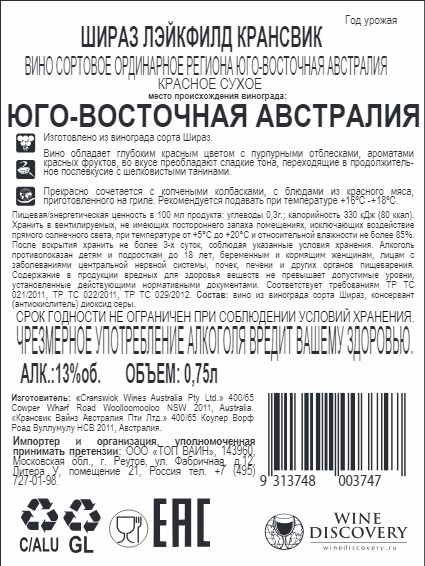 Вино Cranswick Lakefield Shiraz красное сухое, 0,75л производится из винограда сорта шираз, выращенного в Южной Австралии. В богатом, щедром вкусе напитка раскрываются фруктовые и ягодные акценты, дополненные шоколадными нотками, шелковистой танинностью, ненавязчивой кислинкой. Послевкусие продолжительное, приятное. Насыщенный аромат вина представлен шоколадными, землистыми и пряными полутонами, дополненными аккордами шелковицы. Цве�� вина насыщенный, сливовый, на свету переливается пурпурными бликами. Вкус напитка лучше всего раскрывается при подаче в охлажденном до температуры 16-18 градусов виде. Ему нужно дать насытиться кислородом перед сервировкой. Для этого на 15-20 минут вино следует оставить в декантере. Подавать напиток можно в качестве аперитива или же с закусками, блюдами из красного мяса, канапе с паштетами, нарезками, стейками. Открытую бутылку следует хранить в холодильнике.