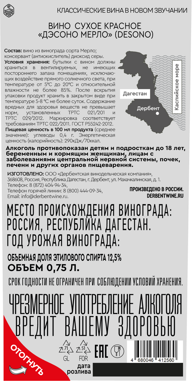 Красное сухое вино, изготовленное из винограда сорта Мерло. Ягоды произрастают на собственных виноградниках Дербентской Винодельческой Компании, расположенных в солнечном Дагестане. Плоды, достигшие оптимальной спелости, собираются вручную, а затем проходят тщательную сортировку, в производство допускаются только лучшие плоды. Винификация проходит по традиционному методу создания красных сухих вин. Все этапы виноделия осуществляются со строгим температурным контролем.