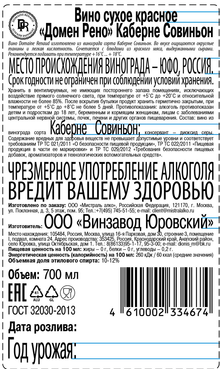 Виноград сорта Каберне Совиньон, консерванты - диоксид серы.