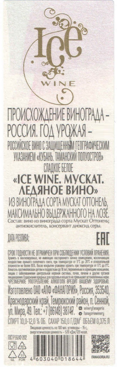 Вино создано из фанагорийского винограда сортов мускат оттонель и мускат голодриги позднего сбора, максимально выдержанного на лозе, с последующей заморозкой гроздей до -7С. Из-за высокой плотности вина и уровня естественного сахара брожение идет очень медленно и требует постоянного контроля виноделов. Результатом производства является ароматное, насыщенное сладкое вино. Вино янтарного цвета с золотистым оттенком. Нежный медово-цветочный аромат с цитронными нотами. Вкус свежий, полный, интенсивный, с оттенками спелых фруктов, меда, цукатов. Послевкусие длительное, медово-цитрусовое. Гармонично сочетается с десертами, изысканными голубыми сырами и свежими фруктами. Бокалом вина можно завершить ужин в качестве диджестива. Рецепт: Трюфельный медовик к белому ледяному вину Ice Wine. Мускат. Рекомендуемая температура подачи: 10-12С. Рекомендуемая подача: бокал для белого вина.