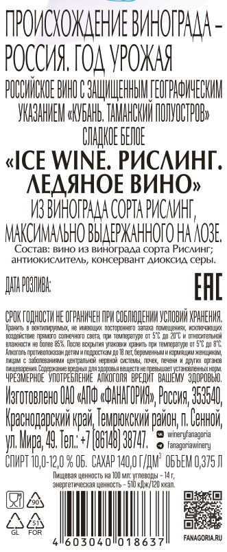 Вино создано из фанагорийского винограда классического европейского сорта рислинг позднего сбора, максимально выдержанного на лозе, с последующей заморозкой гроздей до -7С. Из-за высокой плотности вина и уровня естественного сахара брожение идет очень медленно и требует постоянного контроля виноделов. Результатом производства является ароматное, насыщенное сладкое вино. Из подмерзшего винограда выдавливается сок, количество которого составляет всего 20% от общего объема. На одну бутылку Ice Wine Riesling идет около 15кг винограда, что объясняет его достаточно высокую стоимость. Столь изящное и красивое вино имеет достойный дизайн. Изысканная узкая бутылка украшена красивой серебристой этикеткой с морозным дизайном.