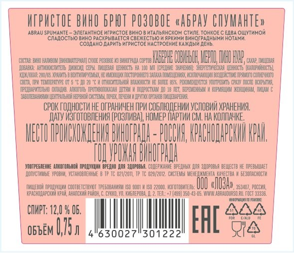 Вино игристое Абрау Дюрсо Спуманте розовое брют, 0.75л