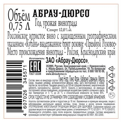 Виноград сортов Пино Нуар, Пино Фран, Каберне Совиньон, Мерло, пищевая добавка - консервант, антиокислитель диоксид серы.