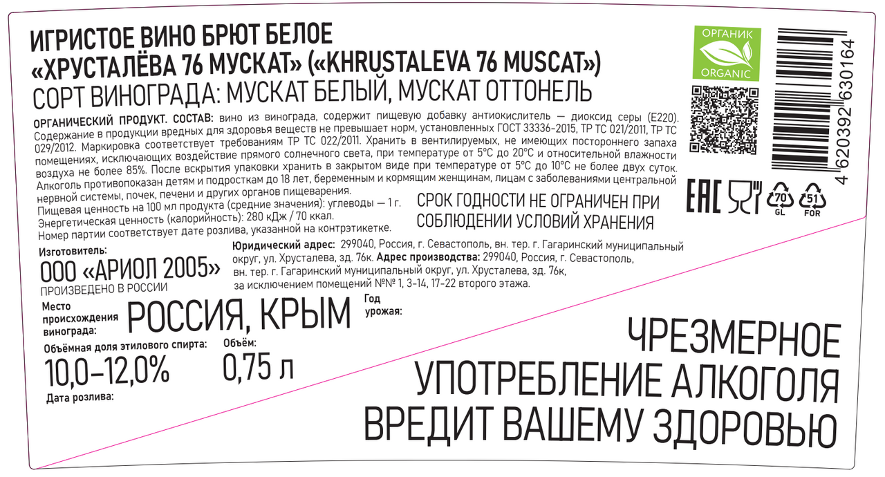 Вино игристое Aya Khrustaleva 76 muscat Органик белое брют, 0.75л