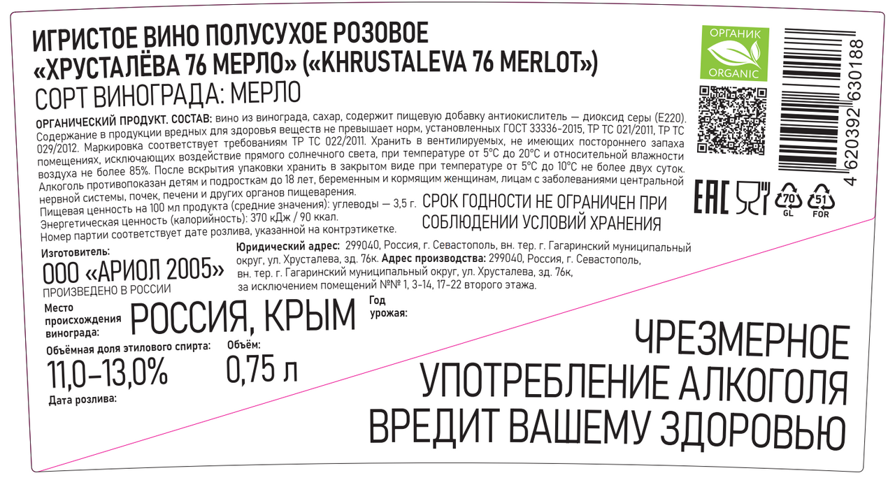 Вино игристое Aya Khrustaleva 76 merlot Органик розовое полусухое, 0.75л