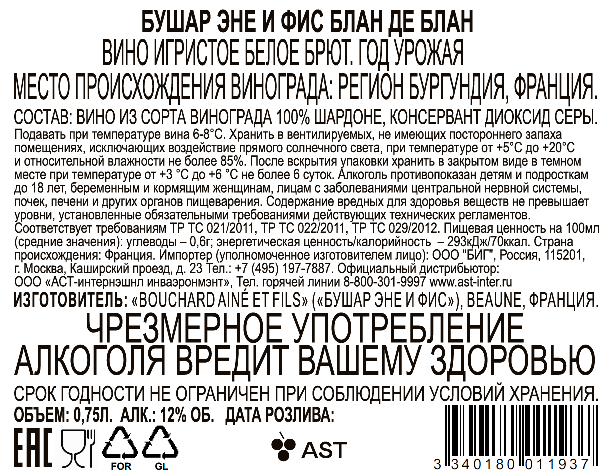 Дом Bouchard Aine & Fils был основан в 1750 году в Боне, историческом центре Бургундии. За свою длинную и богатую 250-летнюю историю хозяйство никогда не прекращало поиски совершенства в качестве, аутентичности стиля. Вина Бушар Эне & Фис выражают кропотливую работу на винограднике, внимание к винификации и выдержке вина. Так, например, применяется ограничение урожайности, используются экологически чистые методы при работе на винограднике. В 1993 году семейный Дом Бушар был продан другой винодельческой семье - Буассе. Первые Бургундские игристые вина появились в начале XIX века в деревнях Рюлли и Нюи-Сен-Жорж. Они очень быстро добились коммерческого успеха. В то время компания Bouchard Aine & Fils была одной из самых известных по производству игристых вин благодаря своему культовому кюве Rotkappchen, а Шарль Бушар был одним из ведущих производителей игристых вин в Бургундии. Теперь, после более чем 50 лет работы исключительно над тихими винами, компания Бушар решила отдать дань уважения своему славному прошлому, выпустив новое игристое вино. Освежающая игристая новинка в ассортименте Бушар Эне & Фис, которая таит в себе все тайны бургундского терруара. Шардоне для создания этого брюта собирается с многочисленных участков в окрестностях Бургундии. Мозаика терруаров гарантирует богатый и многогранный вкус вина. Несмотря на то, что производство осуществляется по более простому и бюджетному, чем традиционная шампанизация, методу Шарма-Мартинотти, Блан де Блан Брют от Bouchard Aine & Fils нельзя назвать неинтересным и линейным. Секрет заключается в том, что базовое вино после первичной ферментации подвергается яблочно-молочному брожению и 3-месячной частичной выдержке в дубовых бочках. Такая технология позволяет сформировать более сложный, округлый и сливочный вкус. Идеально в качестве аперитива, в паре с морепродуктами, рыбными блюдами, молодыми сырами и легкими салатами.