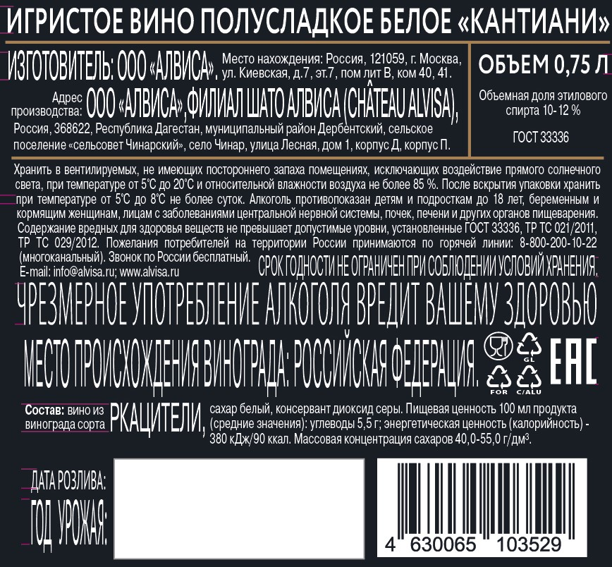 Вино из винограда сорта Ркацители, сахар белый, консервант - диоксид серы.
