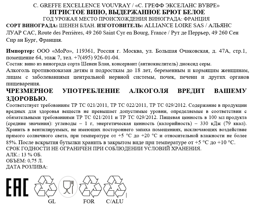 Вино игристое C.Greffe Excellence Vouvray белое брют, 0.75л