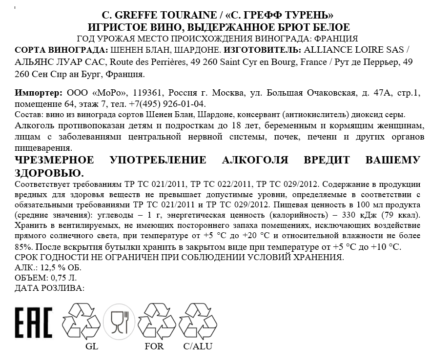 Вино игристое C.Greffe Touraine белое брют, 0.75л