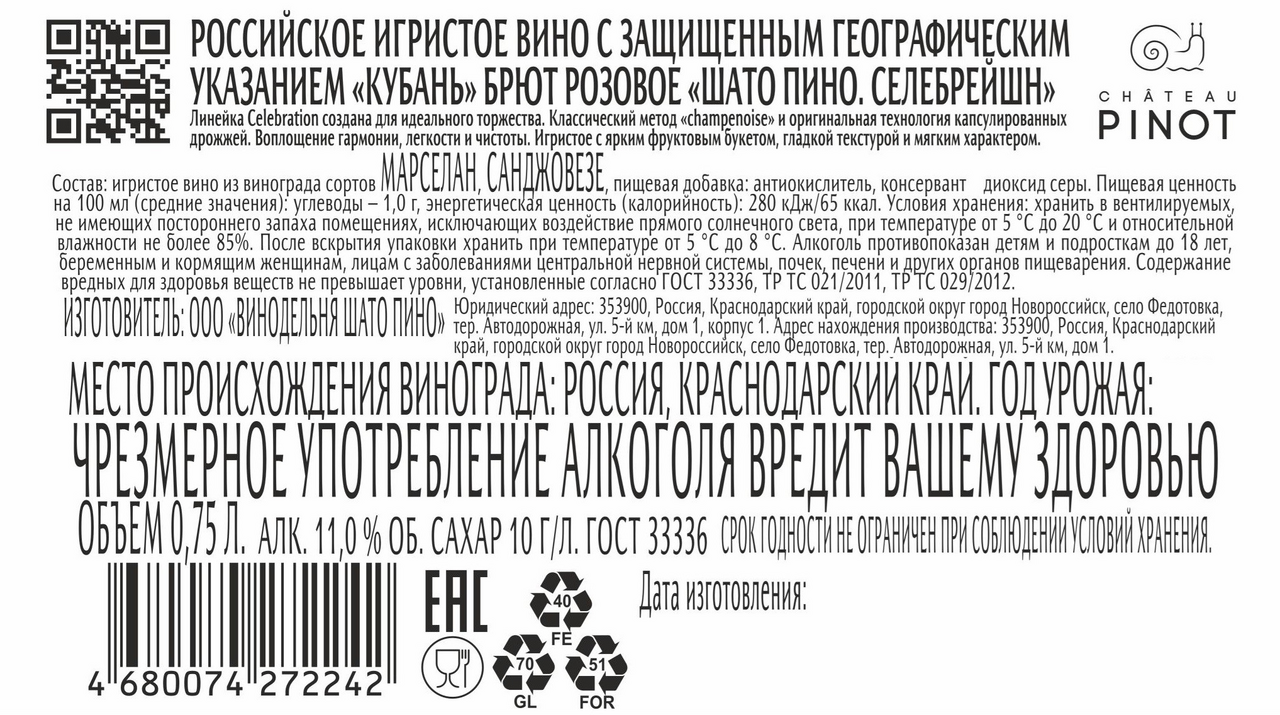 Вино игристое Chateau Pinot Celebration розовое брют, 0.75л