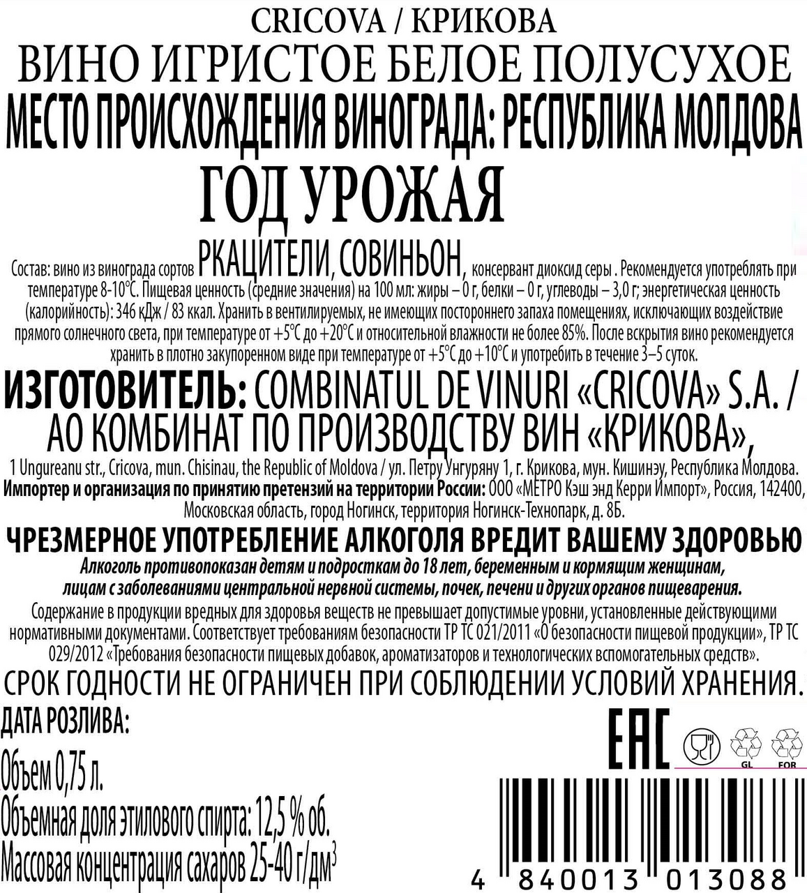 Вино игристое Cricova Ркацители белое полусухое, 0.75л