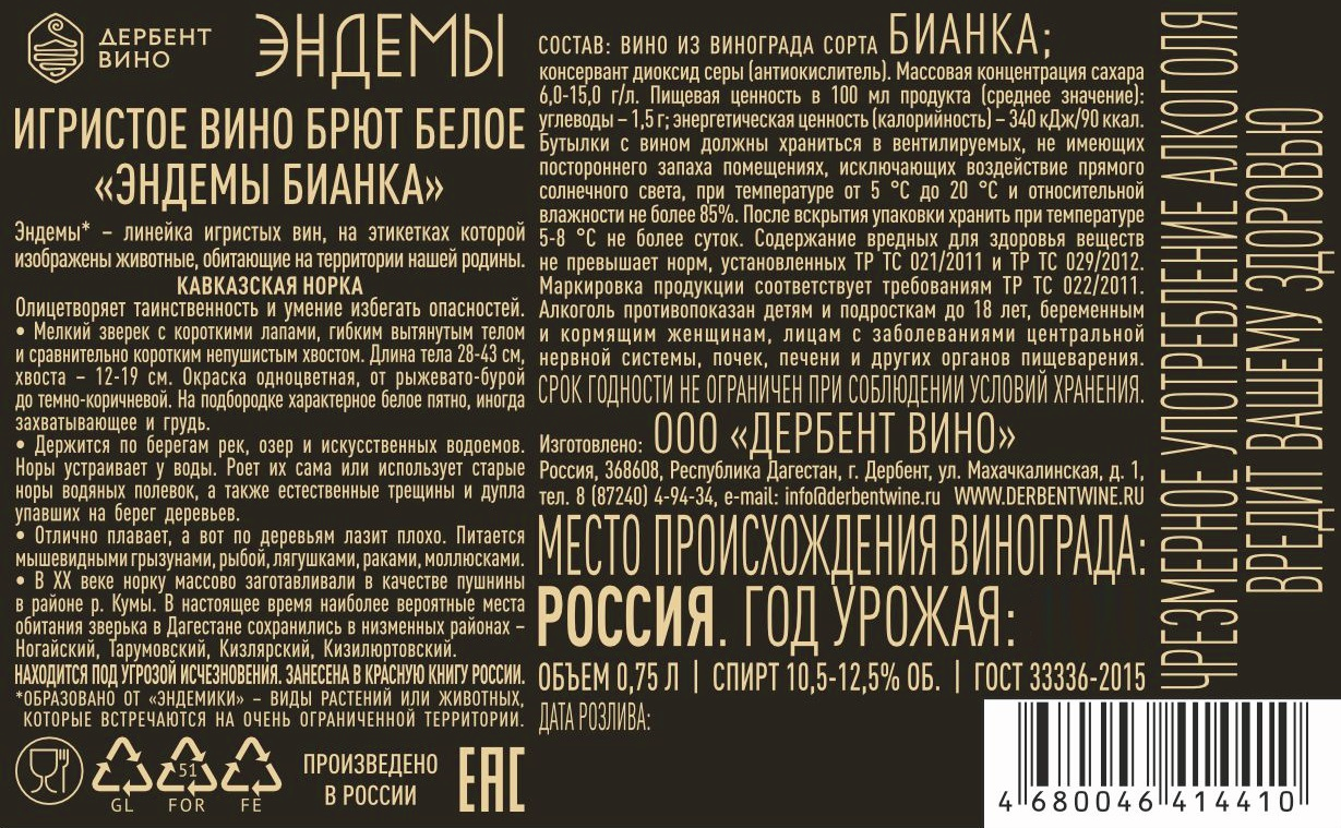 Премиальная линейка Эндемы, это моносортовые игристые вина из популярных белых сортов винограда, которые выращиваются на собственных виноградниках компании Дербент Вино, расположенных в Дагестане. Виноград собирается вручную по достижении ягодами оптимальной спелости, тщательно сортируется и ферментируется при контролируемой температуре в стальных чанах. Игристое вино производится итальянским методом Шарма, что предполагает проведение вторичной ферментации в герметичных автоклавах, где базовое вино бродит с сахаром и дрожжами. Этикетку игристого вина Эндемы Бианка украшает кавказская норка - олицетворяет таинственность и умение избегать опасностей. Цвет светло-соломенный с жемчужным отливом. Аромат яркий, освежающий, с нотами белых цветов и медоносов, зелёного яблока и лёгким минеральным оттенком. Вкус с оттенками груши, персика и тонкими нюансами липового мёда. Послевкусие чистое, фруктовое, с приятной игристой свежестью и живой, сочной кислотностью. Подойдет к легким салатам, блюдам из курицы, овощным закускам, блюдам из рыбы и морепродуктов.