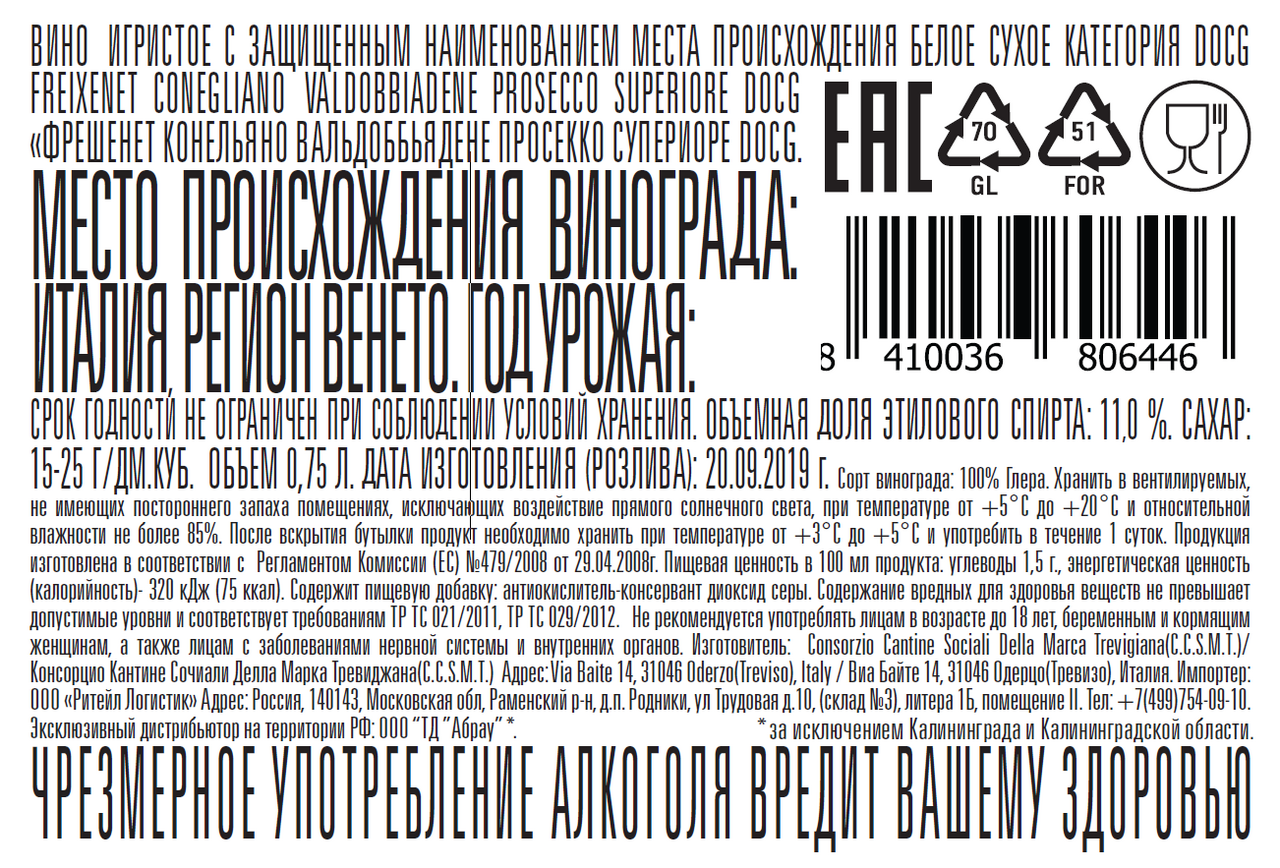 Глера (Просекко): 100%, антиокислитель диоксид серы.