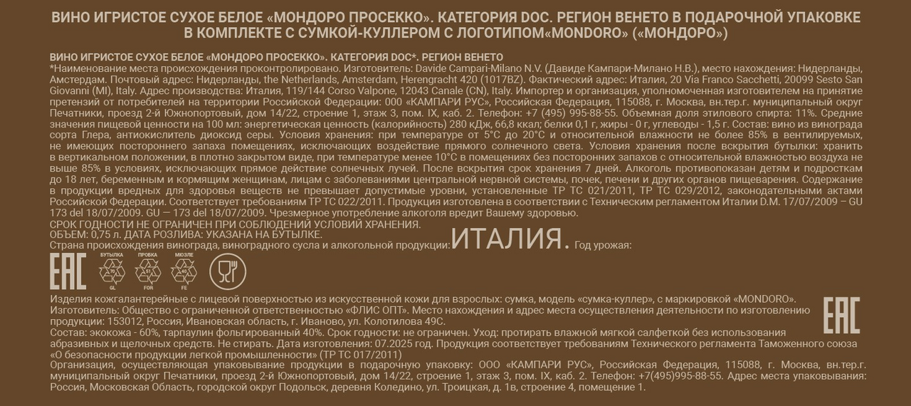Вино игристое Mondoro Prosecco и сумка-куллер в подарочной упаковке белое сухое, 0.75л