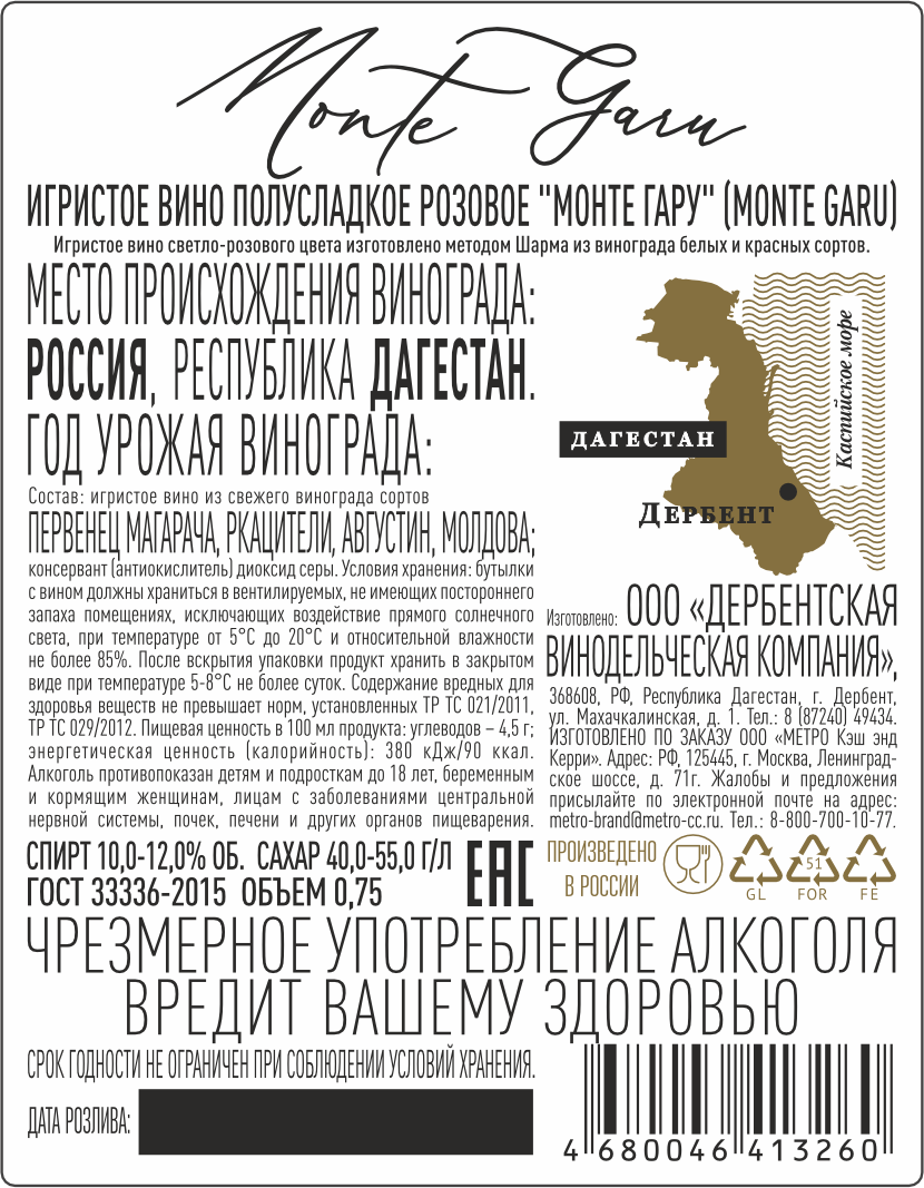 Игристое вино Monte Garu создано из винограда, выращенного в условиях уникального терруара, сложившегося благодаря близости Каспийского моря, сложному горному рельефу и разнообразию типов почв. Это яркое и ароматное вино с природной ненавязчивой сладостью и богатой палитрой ароматов, что делает его отличным сопровождением к разным типам блюд: от легких закусок до десертов.