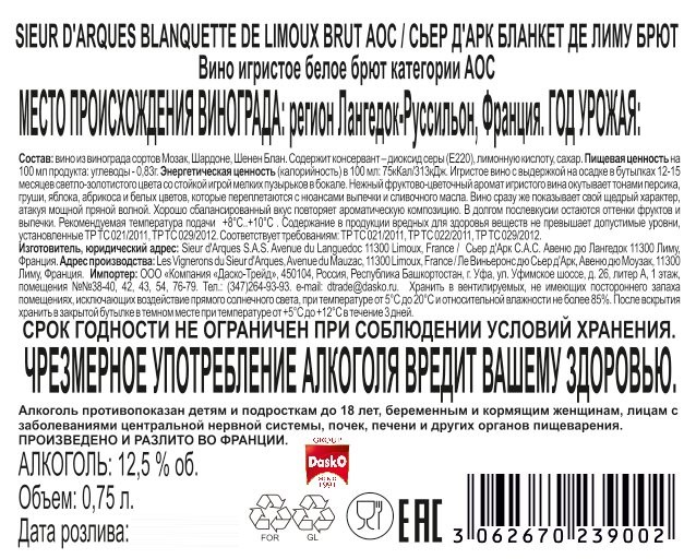 Вино игристое Sieur d'Arques Blanquette de Limoux белое брют, 0.75л