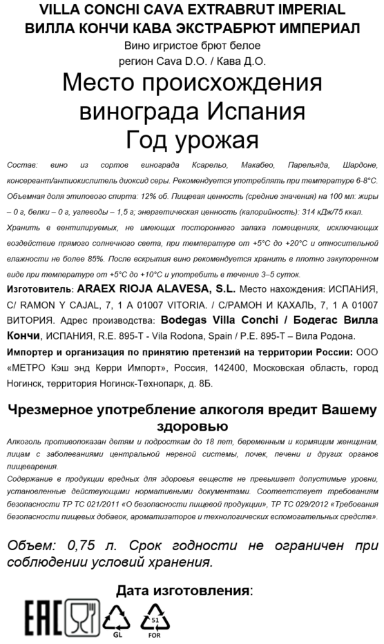 Вино игристое Villa Conchi Cava Imperial белое брют, 0.75л