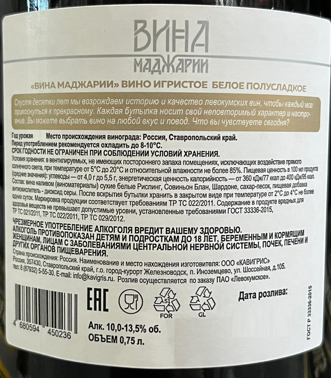 Вина наливом (виноматериала) сухие белые Шардоне, Рислинг, Совиньон Блан, сахар-песок, антиоксидант, консервант-диоксид серы.