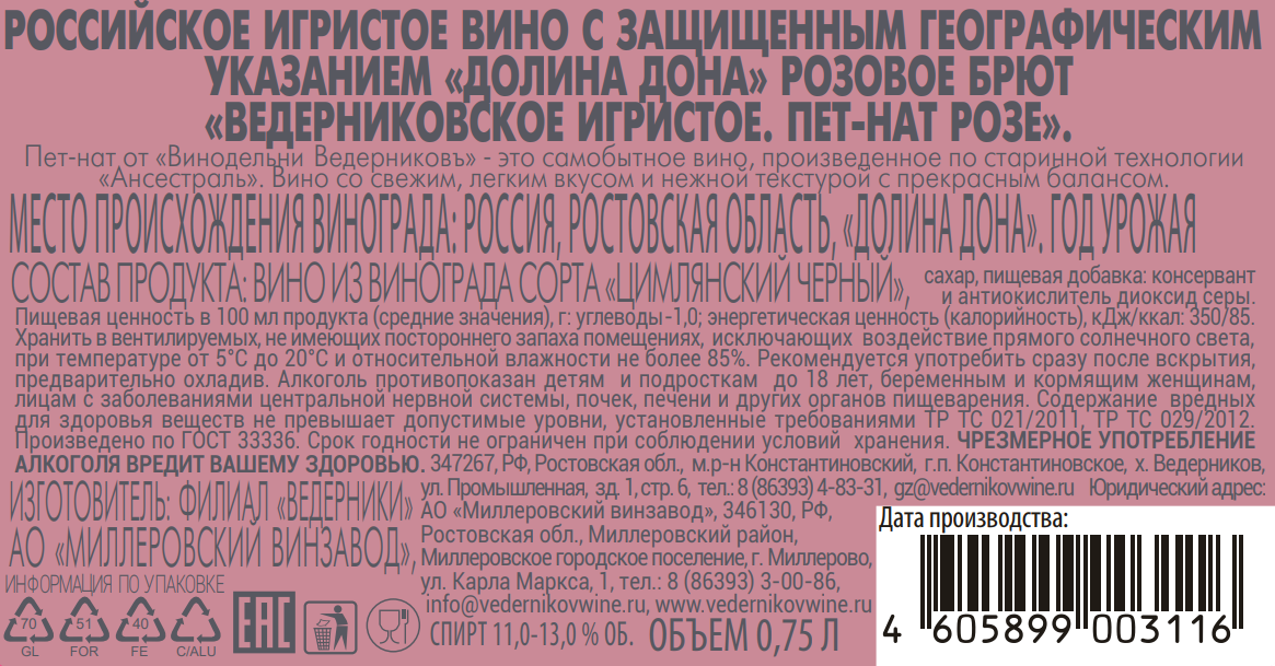 Вино игристое Винодельня Ведерниковъ Пет-нат розовое брют, 0.75л