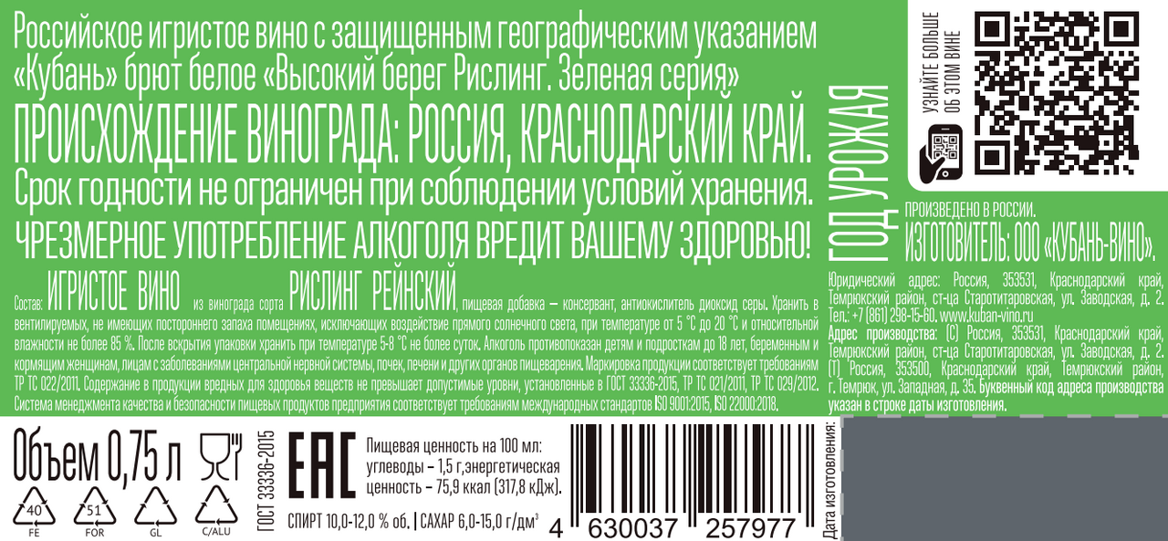 Зелёная серия от бренда Высокий Берег представляет собой освежающие, ароматичные вина из белых сортов винограда с яркой зеленой кожицей, откуда линейка и получила своё название. В серии представлены популярные европейские сорта винограда Рислинг и Траминер розовый, культивирующиеся на Кубани и демонстрирующие уникальные органолептические характеристики, благодаря способности отражать самобытность почвы, климата и географического положения виноградников. Каждый представитель Зелёной серии создан с применением различных технологий производства с целью демонстрации многогранности сортовых особенностей.