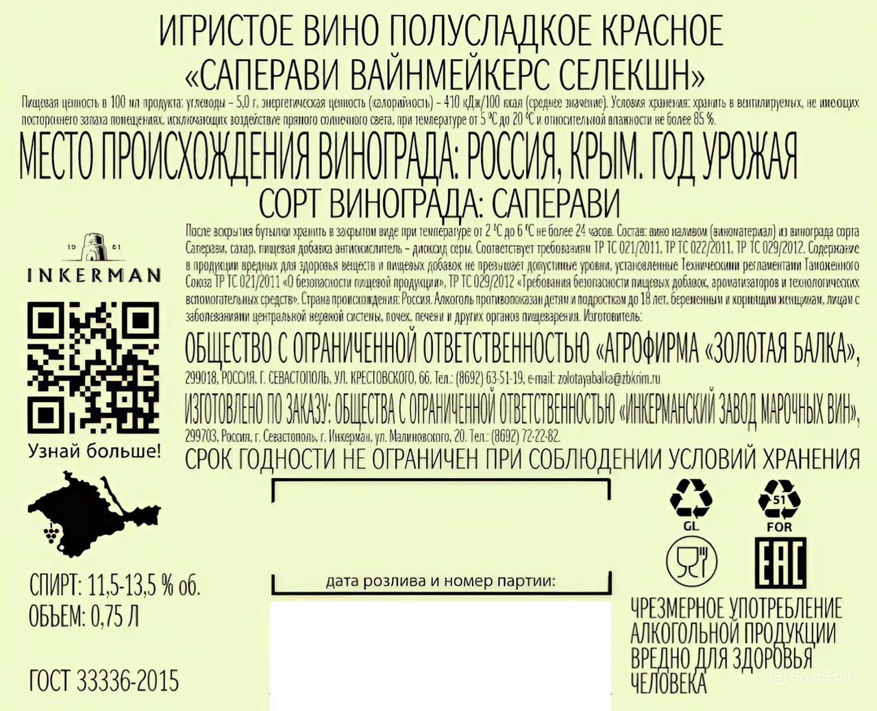 Красное полусладкое игристое вино из винограда сорта Саперави, который выращивается на виноградниках в долинах рек Кача и Альма. Вкус питкий, сбалансированный, с филигранной кислотностью, отлично уравновешивающей фруктовую сладость. Послевкусие мягкое и гармоничное. Комплексный аромат покоряет щедростью фруктовых оттенков, нотами спелых черных ягод и шоколада. Цвет рубиновый. Хорошо сочетается с мясными закусками, сырами, фруктами и ягодами.