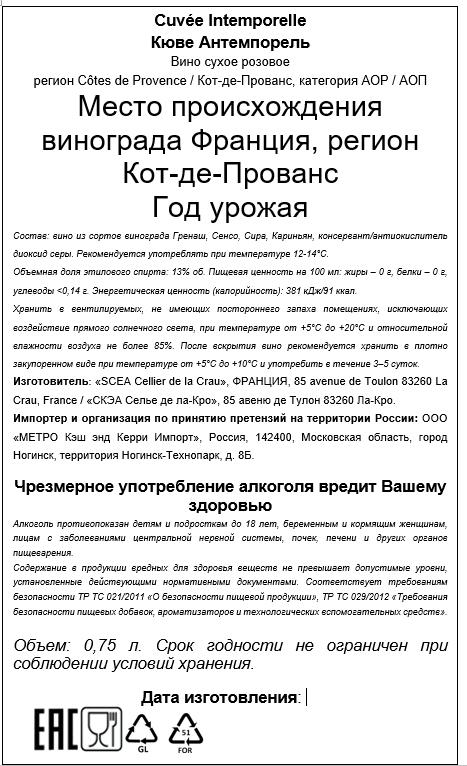 Вино Intemporelle розовое сухое, 0.75л