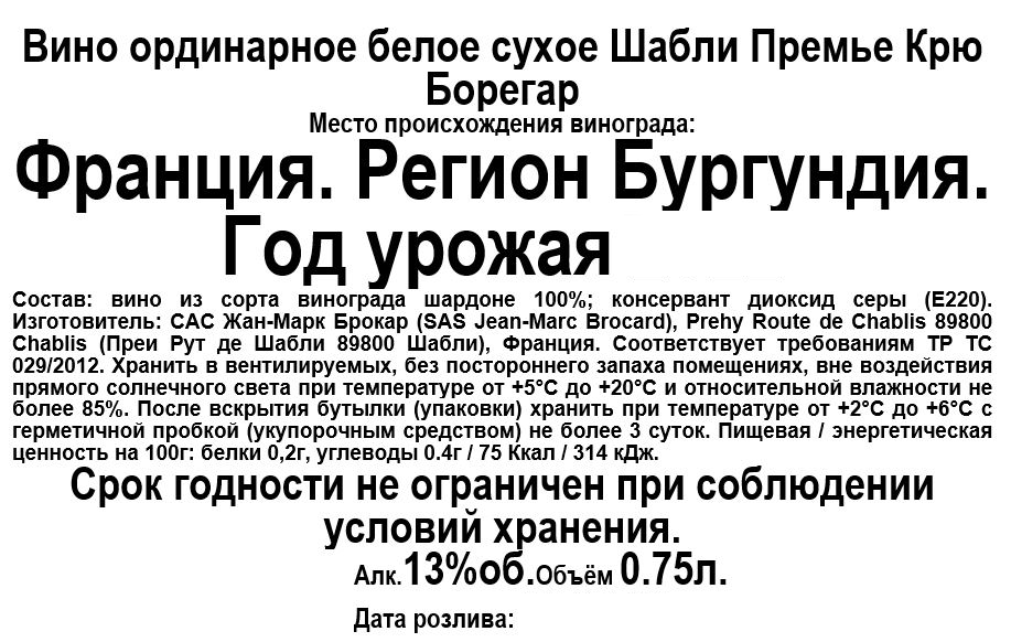 Вино Jean-Marc Brocard Chablis Premier Beauregard белое сухое, 0.75л