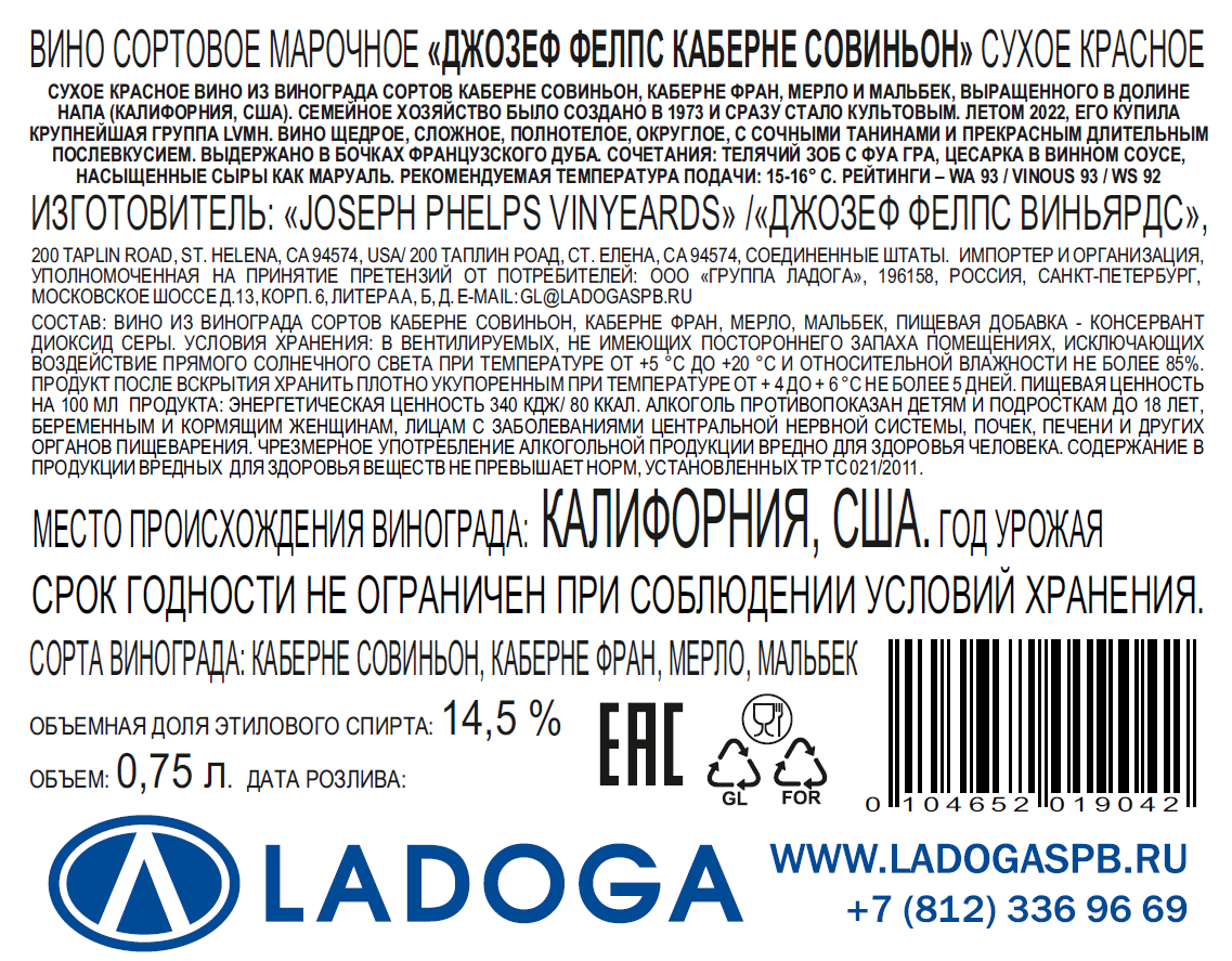 Вино Joseph Phelps Cabernet Sauvignon красное сухое, 0.75л