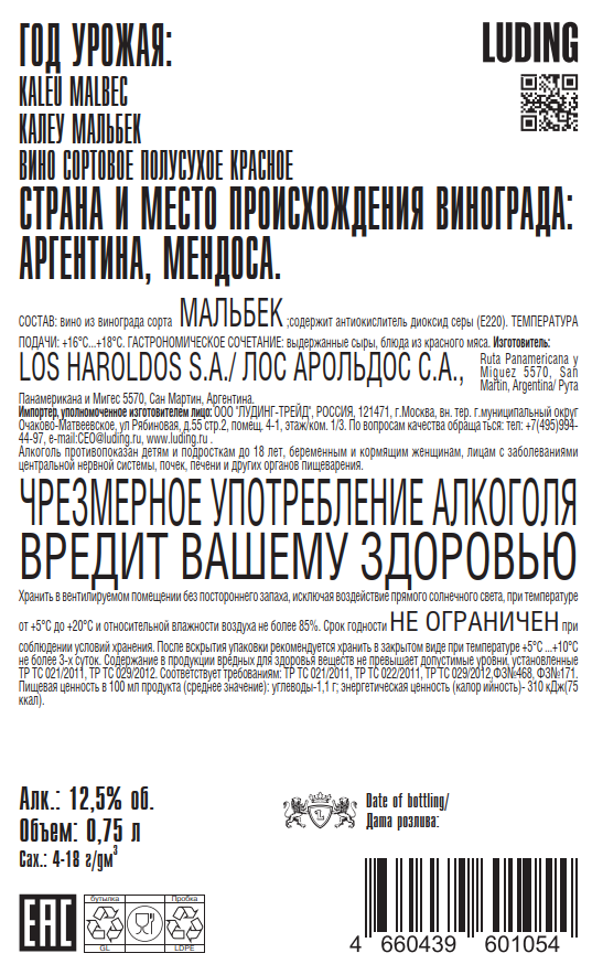 Вино Kaleu Malbec Mendoza Los Haroldos красное полусухое, 0.75л