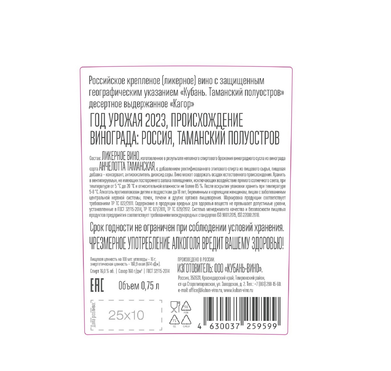 Российское крепленое вино с ЗГУ Кубань. Таманский полуостров десертное выдержанное Кагор – это сочетание традиций и современных технологий. В основе редкий сорт, пришедший к нам из Италии, но выращенный на южных терруарах – Анчелотта Таманская, который обеспечивает насыщенность цвета и выразительность характера вина. Глубокий красно-рубиновый цвет Кагора подкрепляется богатым ароматом, где переплетаются сливочный крем, спелые фрукты и шоколад. Вкус бархатистый, полный, с терпким, продолжительным после вкусием. Рекомендуется подавать вино при температуре 12–16С в сочетании с десертами на основе бисквита, тёмного шоколада, сухофруктов или же с запечёнными мясными блюдами. Производится по традиционной технологии из отборного винограда красных сортов, собранного вручную на виноградниках агрофирмы Южная Таманского полуострова. Кагор - напиток не для шумных вечеринок, а для тихих семейных посиделок или медитации в одиночестве. Его принято пить небольшими глотками, чтобы не только насладиться приятным сладким вкусом, но и настроиться на размышления. Технология производства напитка предполагает брожение при нагревании и постоянном перемешивании раздробленного винограда вместе с кожицей и косточками, что позволяет извлечь из винограда и сохранить все полезные и целебные свойства. Таким образом, Кагор можно даже использовать в лечебных целях в умеренных количествах. Кагор можно подавать к сладкой выпечке, легким десертам и фруктам, традиционно напиток сочетают с пасхальными куличами.