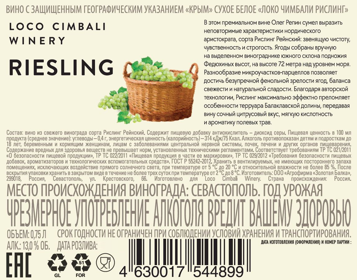Белое сухое вино, созданное из винограда сорта Рислинг Рейнский, который произрастает на виноградниках Балаклавского района. Этот район демонстрирует одну из красивейших бухт планеты — Балаклавскую бухту. Балаклава является идеальным местом для настоящих ценителей хорошего вина и изысканных блюд. Сбор урожая проводится вручную в момент оптимальной спелости ягод, на винодельне ягоды подвергаются сортировке с последующей ферментацией при температуре 15-18 С. Выдерживается вино на осадке. Светло-соломенный цвет с золотистым оттенком по краю. Аромат с яркими цитрусовыми оттенками, тонами косточковых фруктов, цедры апельсина, белых цветов и мёда. Сбалансированное, структурированное вино с гладкой текстурой, гармоничной кислотностью, фруктовым вкусом и длительным освежающим минеральным послевкусием.