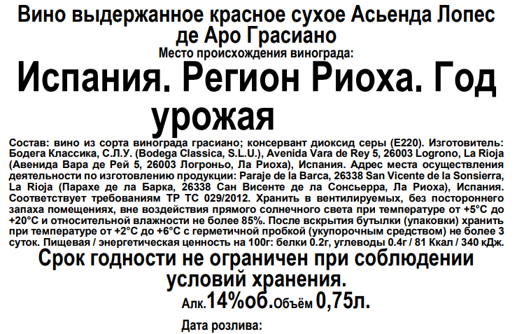 Вино Hacienda Lopez de Haro Грасиано красное сухое, 0.75л