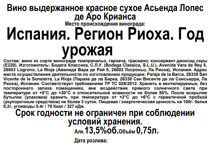 Виноград сортов Темпранильо, Гарнача, Грасиано, пищевая добавка - консервант, антиокислитель диоксид серы.