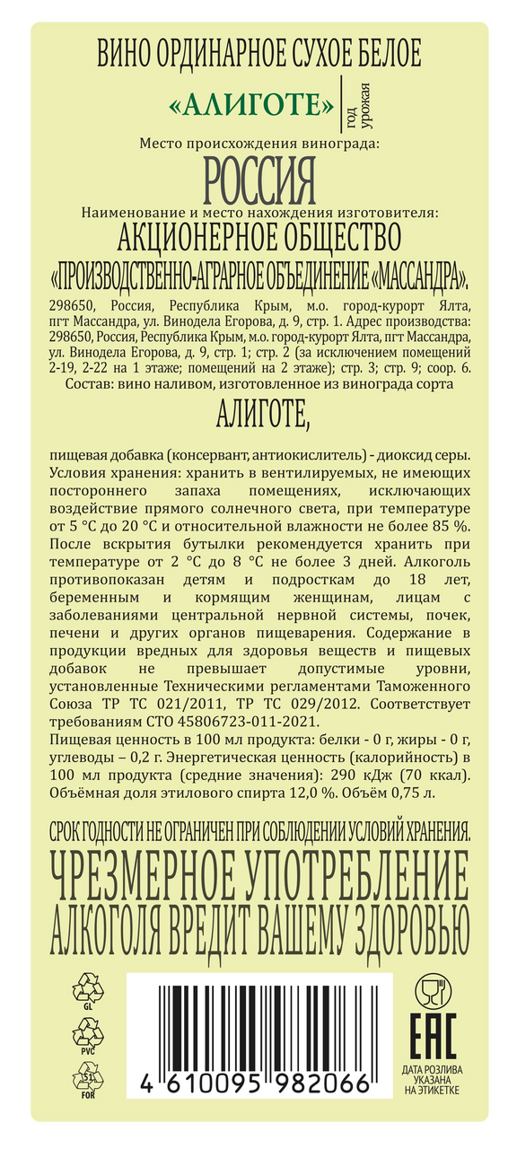 Алиготе - вино, созданное из собственного винограда сорта Алиготе, выращенного в уникальных природно-климатических условиях Южного берега Крыма. По окончании сбора урожая, ягоды отправляются на винодельню, где подвергаются традиционной винификации при контролируемой температуре. Выдерживается вино не менее двух лет в дубовых бочках в погребах винодельни.Вино Алиготе Массандра является отличным аперитивом, а также гармонично сочетается с блюдами из белого мяса, рыбы и морепродуктами.