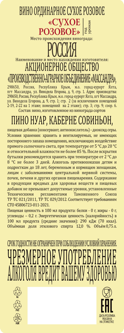 Сухое розовое - вино созданное из собственного винограда сортов: Пино черный, Мускат Гамбургский, Ркацители, Каберне Совиньон, выращенного в уникальных природно-климатических условиях Южного берега Крыма.