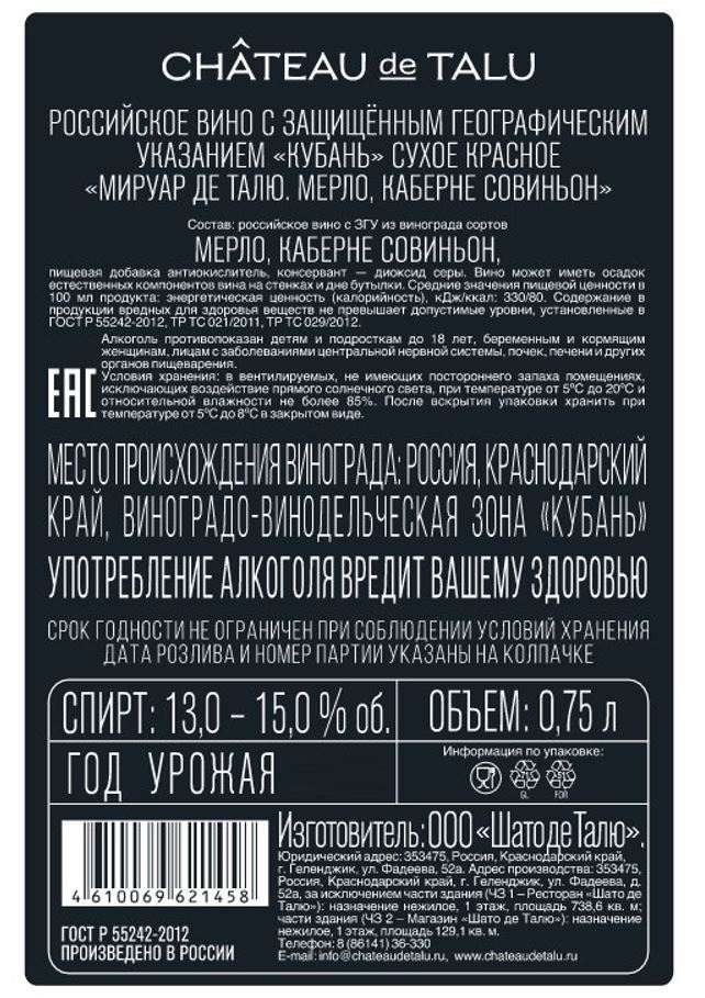 Виноград сортов Мерло, Каберне Совиньон, пищевая добавка антиокислитель, консервант диоксид серы.