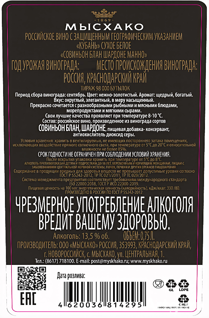 Вино Мысхако Манно Совиньон Блан и Шардоне белое сухое, 0.75л