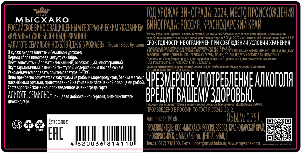 Вино Мысхако Ноубл Эйдж 6 урожаев Алиготе и Семильон белое сухое, 0.75л