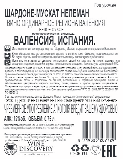 Вино Neleman Chardonnay-Muscat белое сухое, 0,75л изготовлено из винограда двух сортов: шардоне и мускат. Оно производится по классической технологии, ферментация осуществляется в стальных резервуарах без контроля температуры. Сбалансированный, гармоничный вкус напитка представлен фруктовыми и цветочными нюансами. Послевкусие продолжительное, с освежающей кислотностью. Вино сочетается с тушеной рыбой, овощами, приготовленным на гриле. Его допускается подавать в качестве аперитива. Напиток можно комбинировать с молодыми сырами, деликатесами, колбасами. Оттенок напитка светло-соломенный, красиво переливается золотистыми бликами. В освежающем аромате вина представлены яблочные, цветочные, медовые ноты. Напиток дополнит семейное застолье или романтический ужин. Подавать его рекомендуется охлажденным до 6-8 градусов по Цельсию. Потенциал хранения составляет 2-3 года.