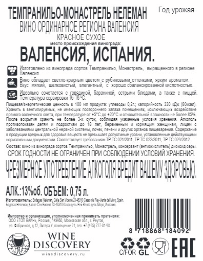 Вино Neleman, Tempranillo-Monastrell красное сухое, 0,75л изготовлено из винограда сортов темпранильо и монастрель, которые выращены в испанском регионе Валенсия. Оно хорошо сочетается с блюдами из мяса, приготовленными на гриле, выдержанными сырами. Виноград собирается вручную, после чего прессуется и ферментируется. Напиток темно-рубинового цвета, в бокале, при попадании солнечных лучей, начинает переливаться малиновыми бликами. В многослойном аромате преобладают вишневые, шоколадные, сливовые ноты, дополненные акцентами чая, трав и кожи. Вкус вина яркий и гармоничный, представлен фруктовыми и ягодными нюансами, в послевкусии ощущаются пряные и травяные полутона. К столу напиток рекомендуется подавать охлажденным до 16-18 градусов. Перед употреблением вину необходимо подышать. Для этого необходимо перелить алкоголь в декантер и оставить на 15-20 минут. Потенциал хранения составляет 5 лет.